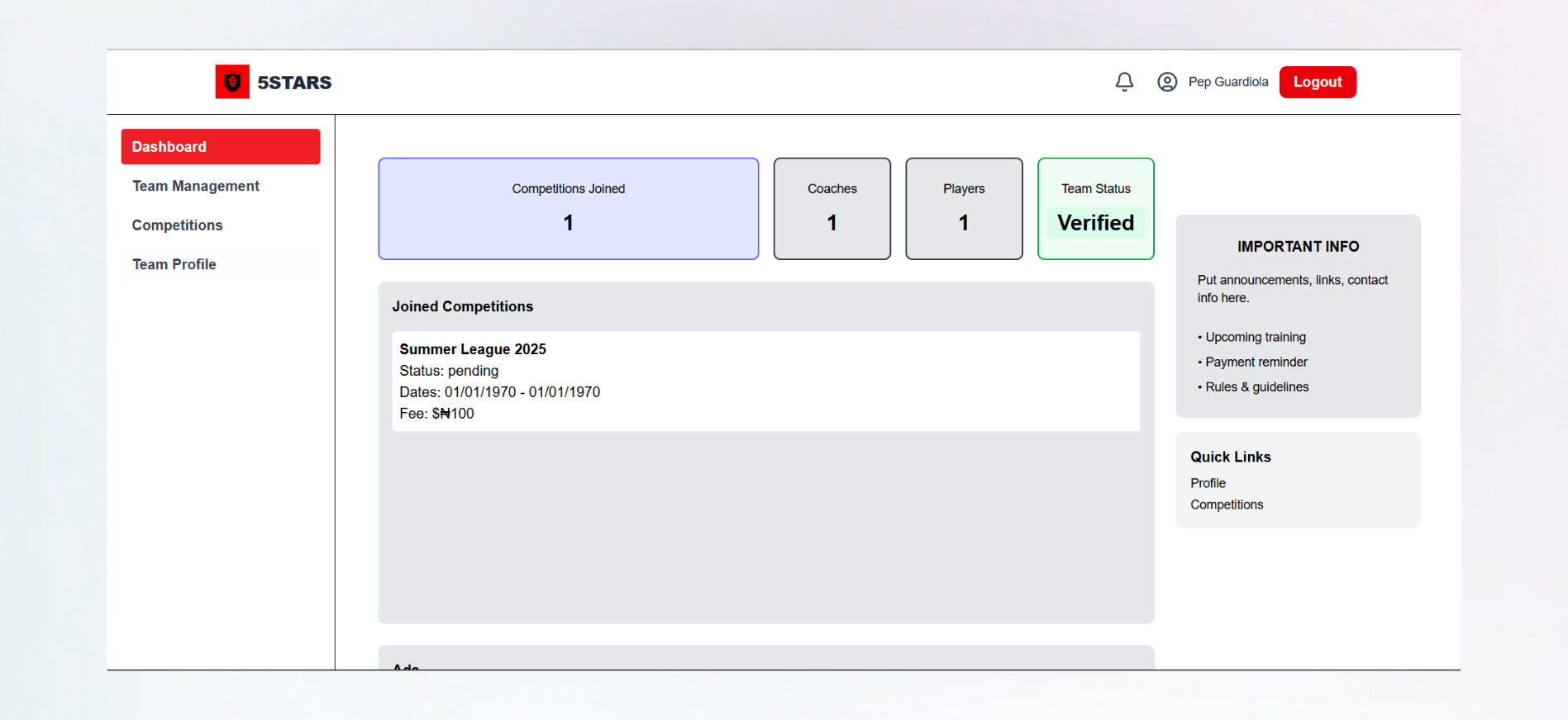 Manage your roster, players, and team details efficiently.